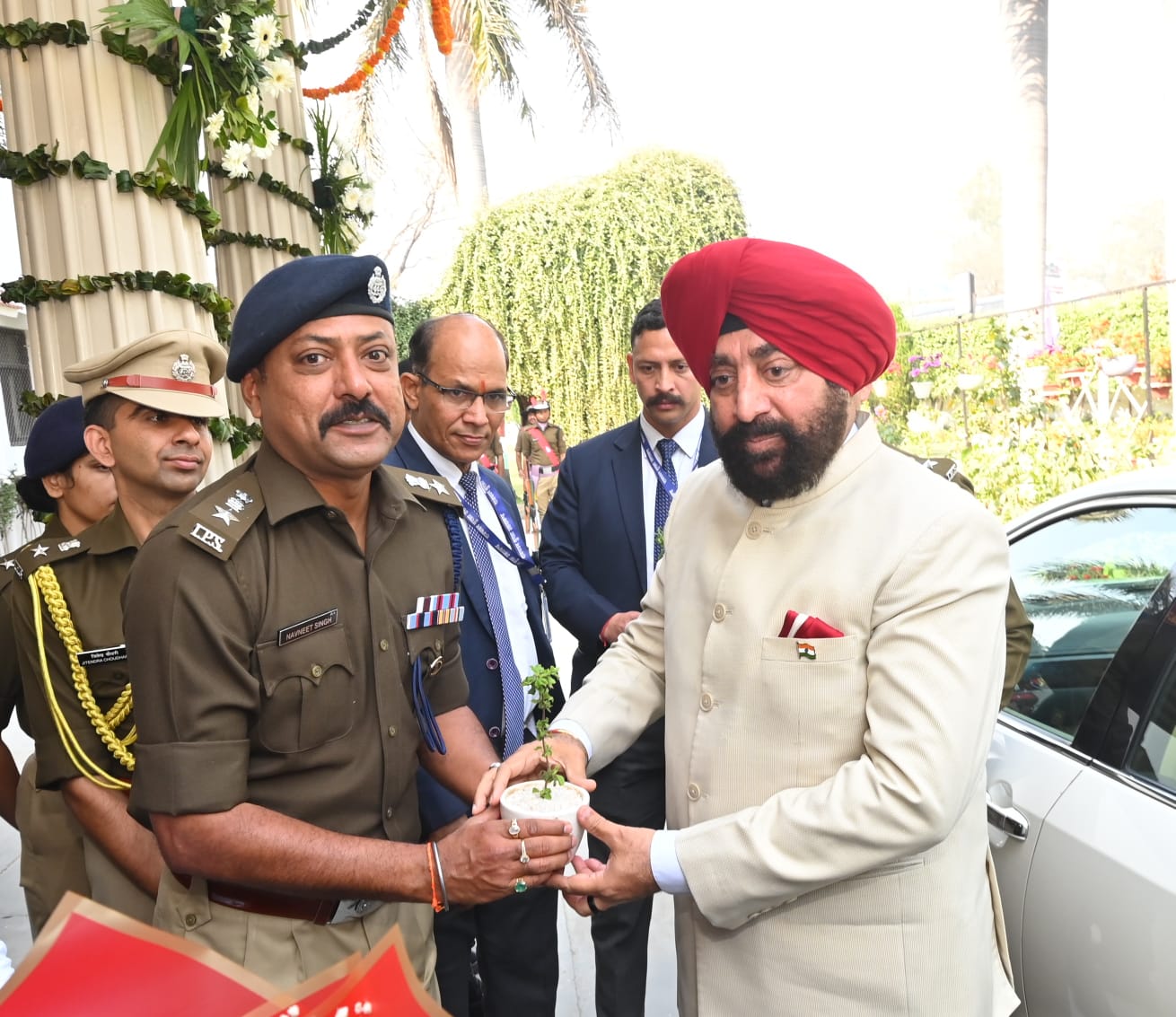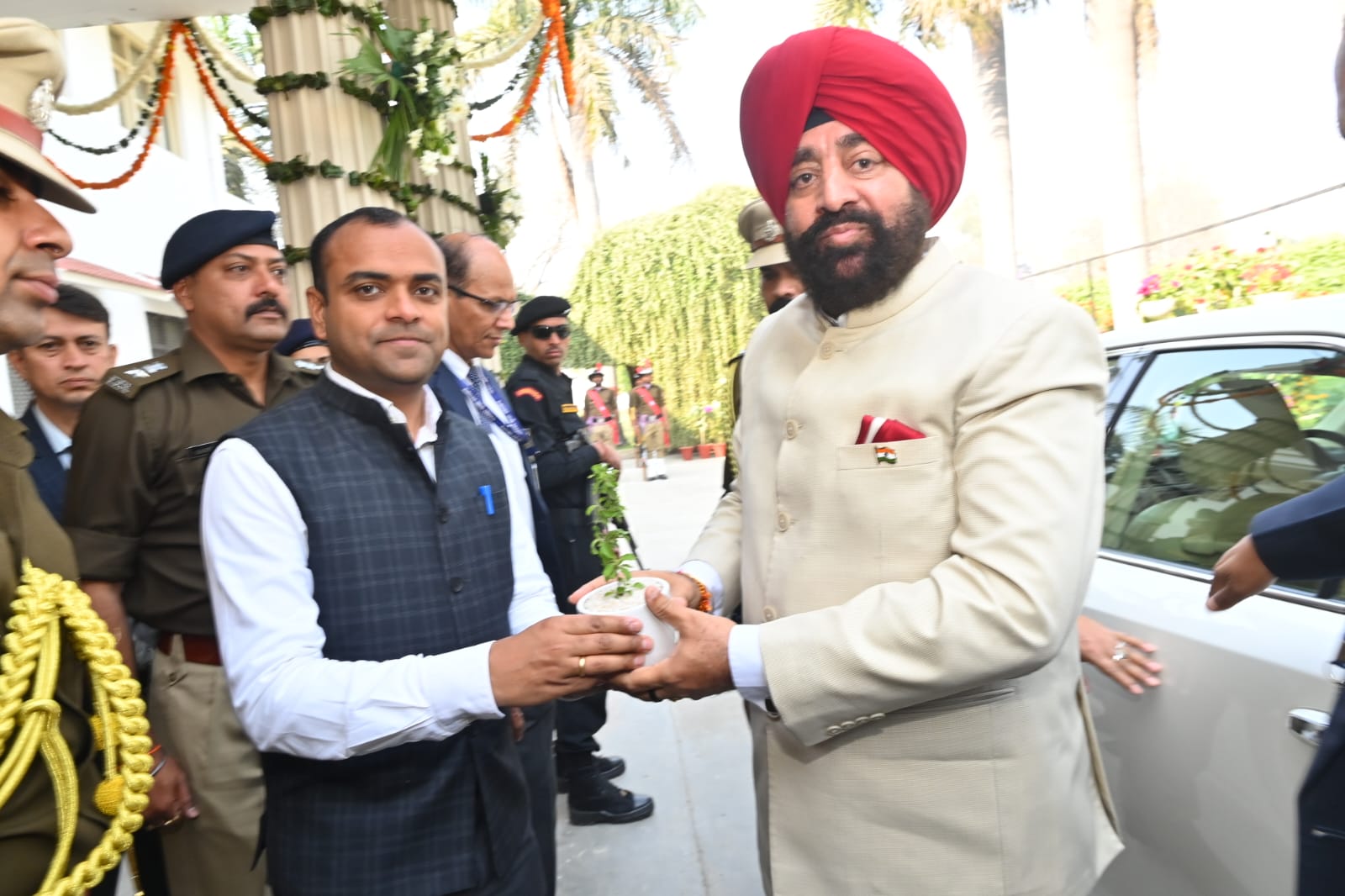जनपद आगमन पर जिलाधिकारी मयूर दीक्षित एवं वरिष्ठ पुलिस अधीक्षक नवनीत सिंह भुल्लर ने तुलसी का पौधा भेंटकर महामहिम राज्यपाल का स्वागत किया।