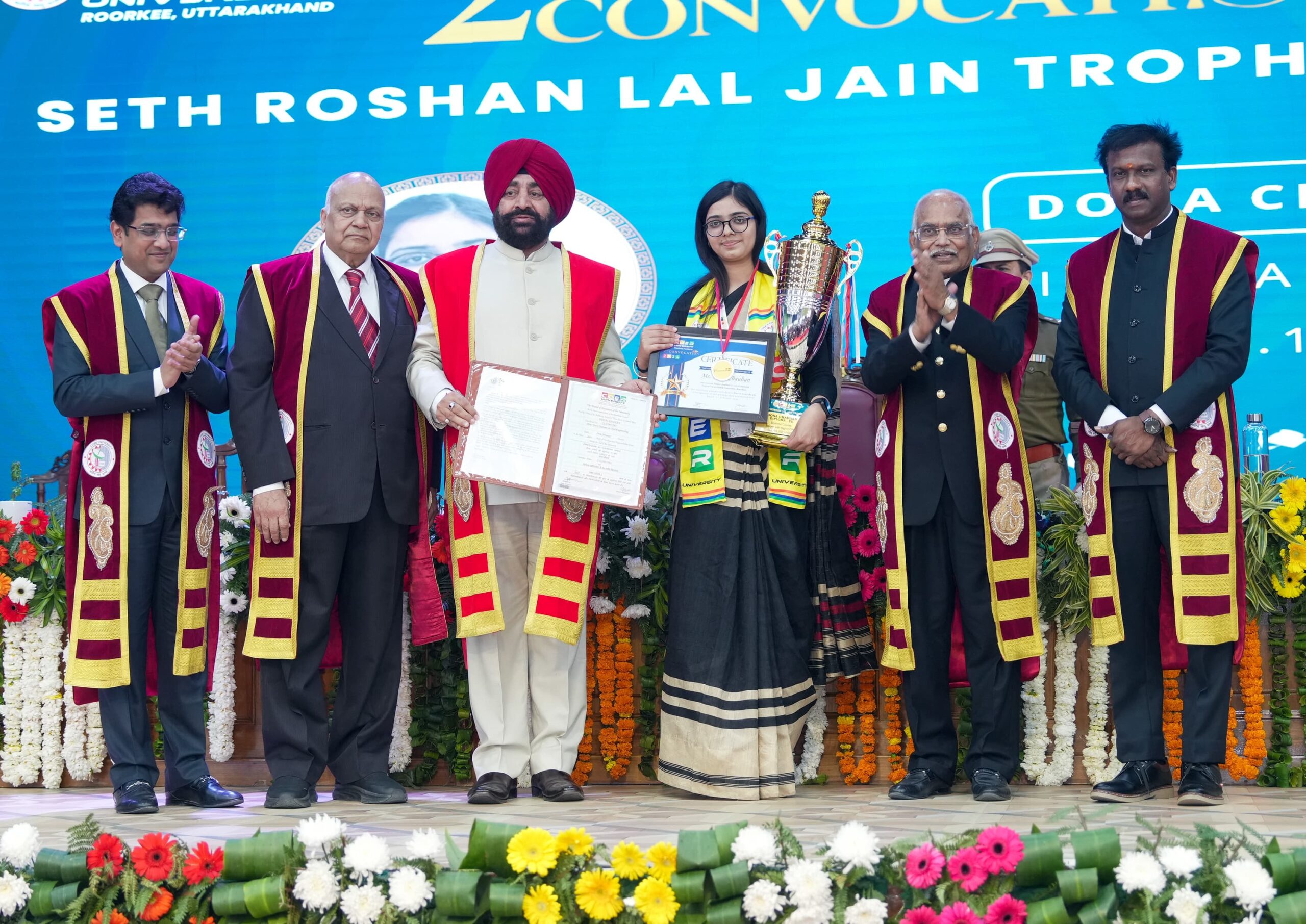 दीक्षांत समारोह में सेठ रोशन लाल जैन ट्रॉफी तीन विद्यार्थियों सुश्री आयुषी पंवार (बी. कॉम ऑनर्स, 2022-25) को विश्वविद्यालय स्तर पर उच्चतम 9.9 सीजीपीए प्राप्त करने के लिए, सुश्री डोना चौहान (डिप्लोमा इन सिविल इंजीनियरिंग, 2023-25) को 9.16 सीजीपीए हासिल करने के लिए और श्री हनी चौधरी (एमसीए, 2023-25) को 9.5 सीजीपीए हासिल करने के लिए दी गई।