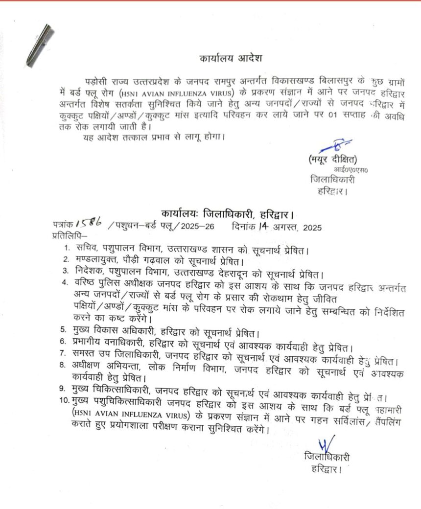 जिला मजिस्ट्रेट एवम् जिलाधिकारी मयूर दीक्षित ने जानकारी देते हुए बताया कि पड़ोसी राज्य उत्तर प्रदेश के जनपद रामपुर अन्तर्गत विकासखण्ड बिलासपुर के कुछ ग्रामों में बर्ड फ्लू रोग (HSNI AVIAN INFLUENZA VIRUS) के प्रकरण संज्ञान में आने पर जनपद हरिद्वार अन्तर्गत विशेष सतर्कता सुनिश्चित किये जाने हेतु अन्य जनपदों / राज्यों से जनपद भरिद्वार में कुक्कुट पक्षियों/अण्डों / कुक्कुट मांस इत्यादि परिवहन कर लाये जाने पर 01 सप्ताह की अवधि तक रोक लगायी जाती है। यह आदेश तत्काल प्रभाव से लागू रहेगा।