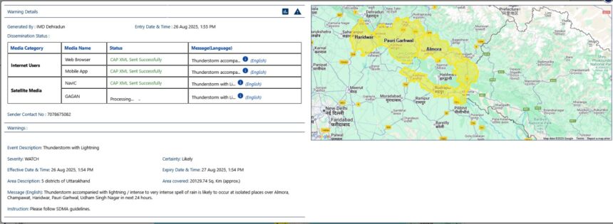 अगले 24 घंटों मे ( येल्लो अलर्ट दिनांक 26/08/2025,1:54 PM बजे से 27/08/ 2025, 1:54 PM बजे तक ) *जनपद*-अल्मोडा, चंपावत, हरिद्वार, पौडी गढ़वाल, उधम सिंह नगर में अलग-अलग स्थानों पर *यथा*- रूड़की, लक्सर, कोटद्वार, लैंडस्डाउन, काशीपुर, खटीमा, लोहाघाट, द्वाराहाट, तथा इनके आस पास के क्षेत्रों मे बिजली कड़कने के साथ गरज के साथ तूफान आने / तीव्र से बहुत तीव्र बारिश होने की संभावना है |