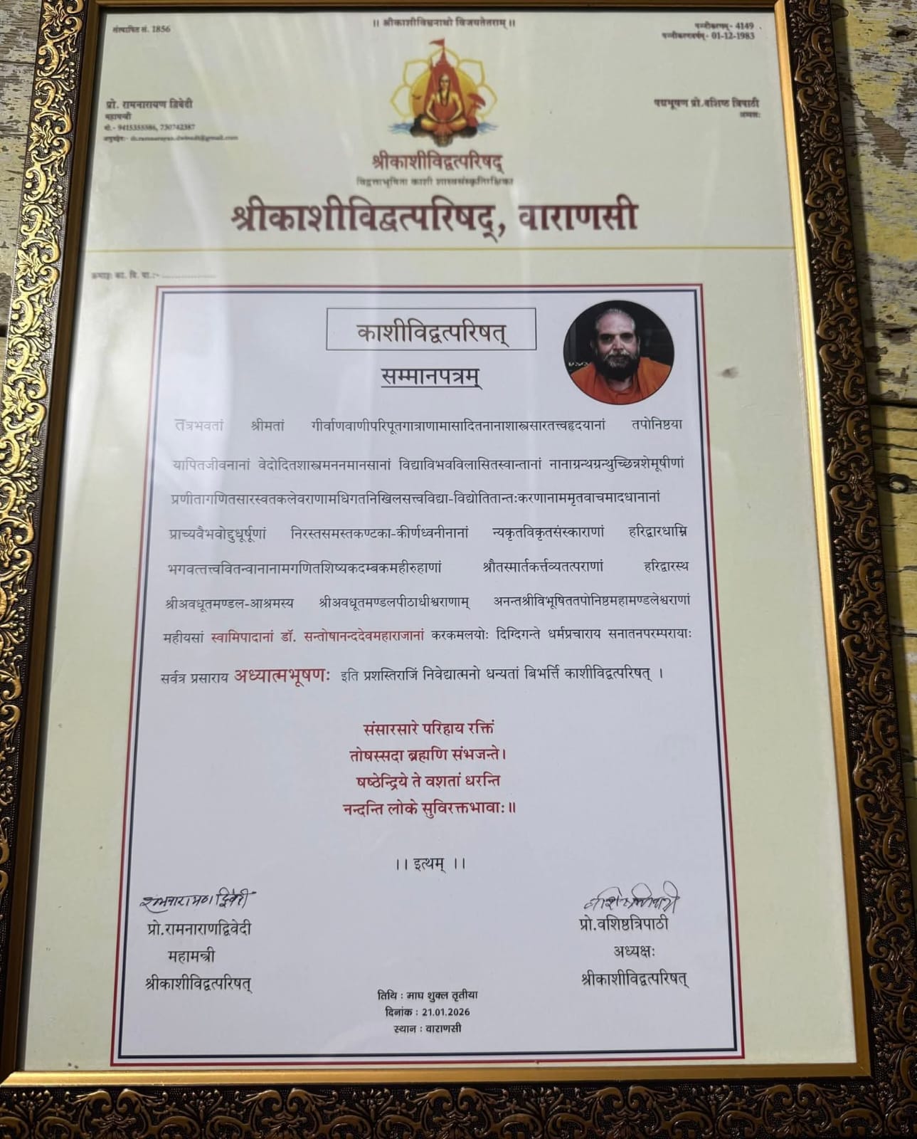 समाज के लिए काशी विद्वत परिषद की ओर से महामंडलेश्वर डॉ. स्वामी संतोषानंद देव महाराज ‘को मिला आध्यात्म विभूषण’ का सम्मान