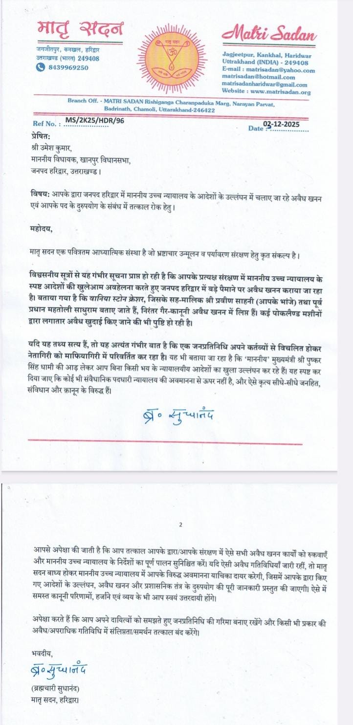 हरिद्वार।मातृ सदन ने खानपुर के विधायक उमेश कुमार पर अत्यंत गंभीर आरोप लगाते हुए कहा है कि हरिद्वार में अवैध खनन का पूरा रैकेट उनके संरक्षण में फल-फूल रहा है और वह माननीय उच्च न्यायालय के आदेशों को खुलेआम ठेंगा दिखा रहे हैं।