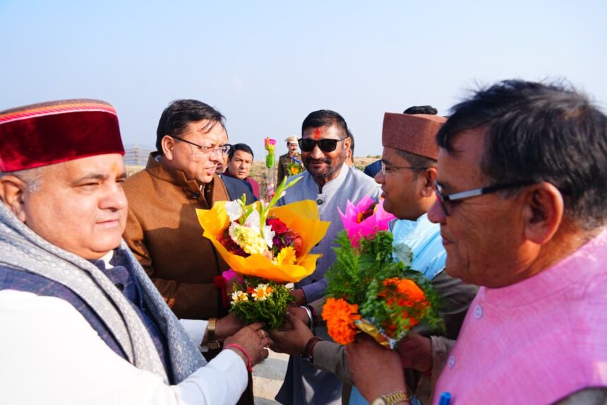 मुख्यमंत्री के भराड़ीसैंण (गैरसैंण) आगमन पर विधायक श्री अनिल नौटियाल, जिलाधिकारी चमोली श्री गौरव कुमार, एसपी श्री सुरजीत सिंह पंवार एवं स्थानीय लोगों ने उनका स्वागत किया